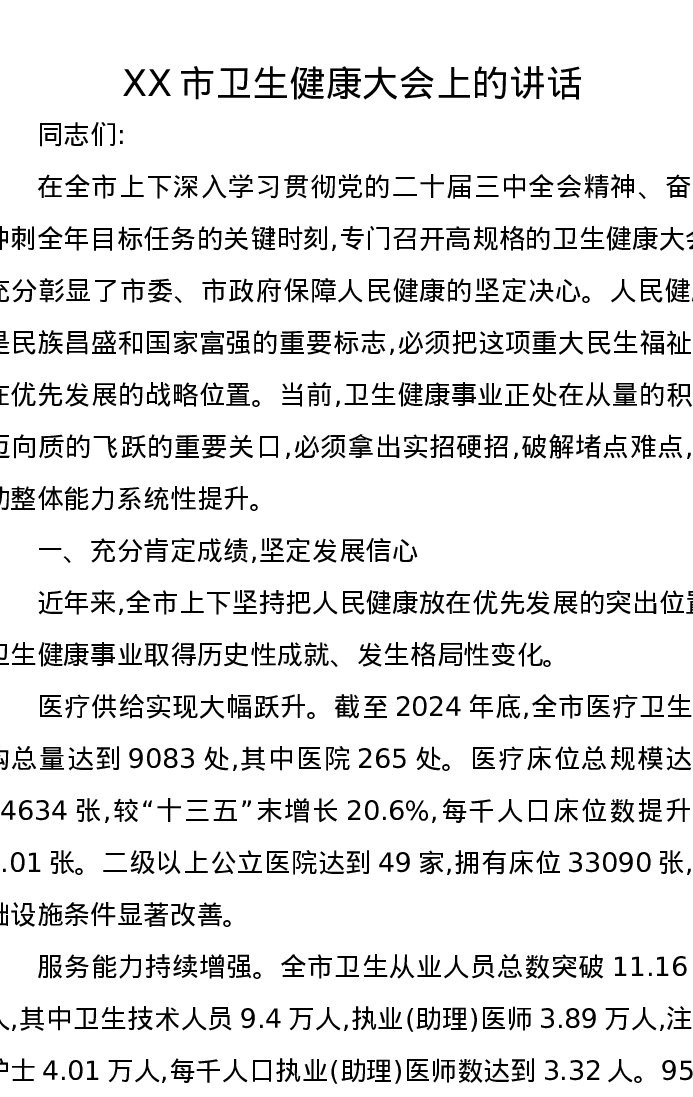 XX市卫生健康大会上的讲话