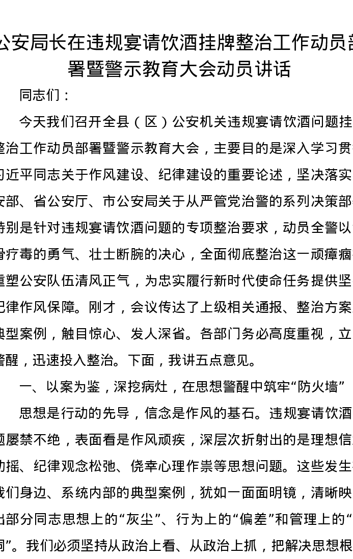 公安局长在违规宴请饮酒挂牌整治工作动员部署暨警示教育大会动员讲话
