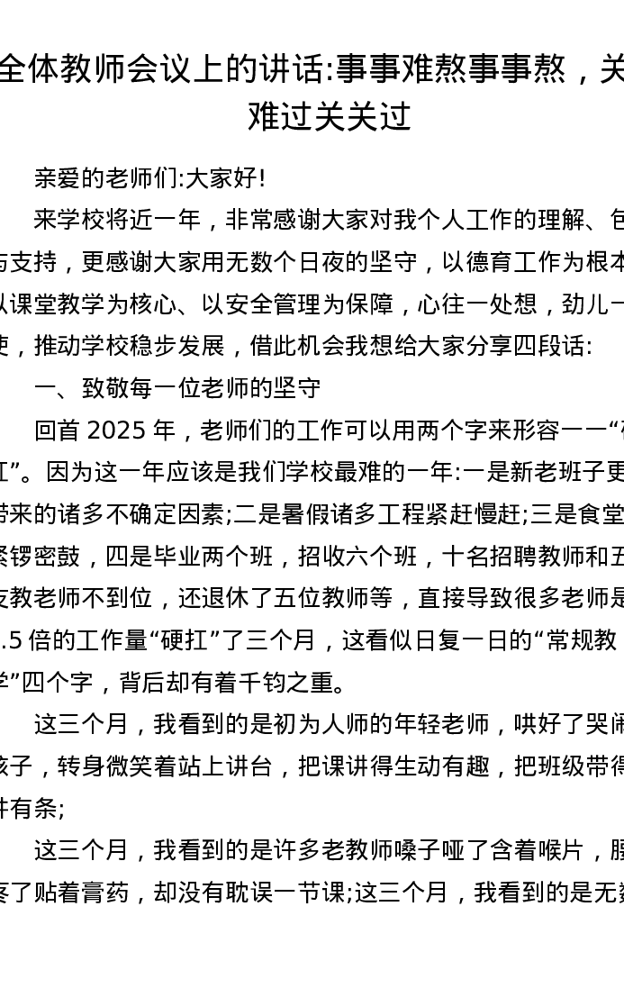 全体教师会议上的讲话:事事难熬事事熬,关关难过关关过