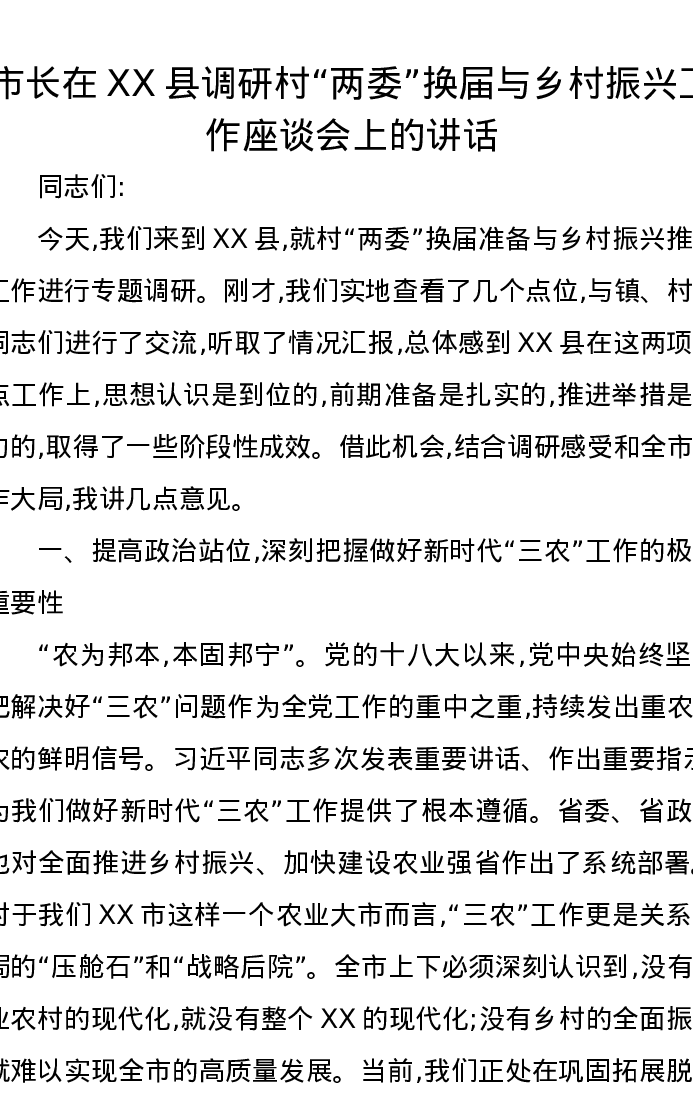 市长在XX县调研村两委换届与乡村振兴工作座谈会上的讲话