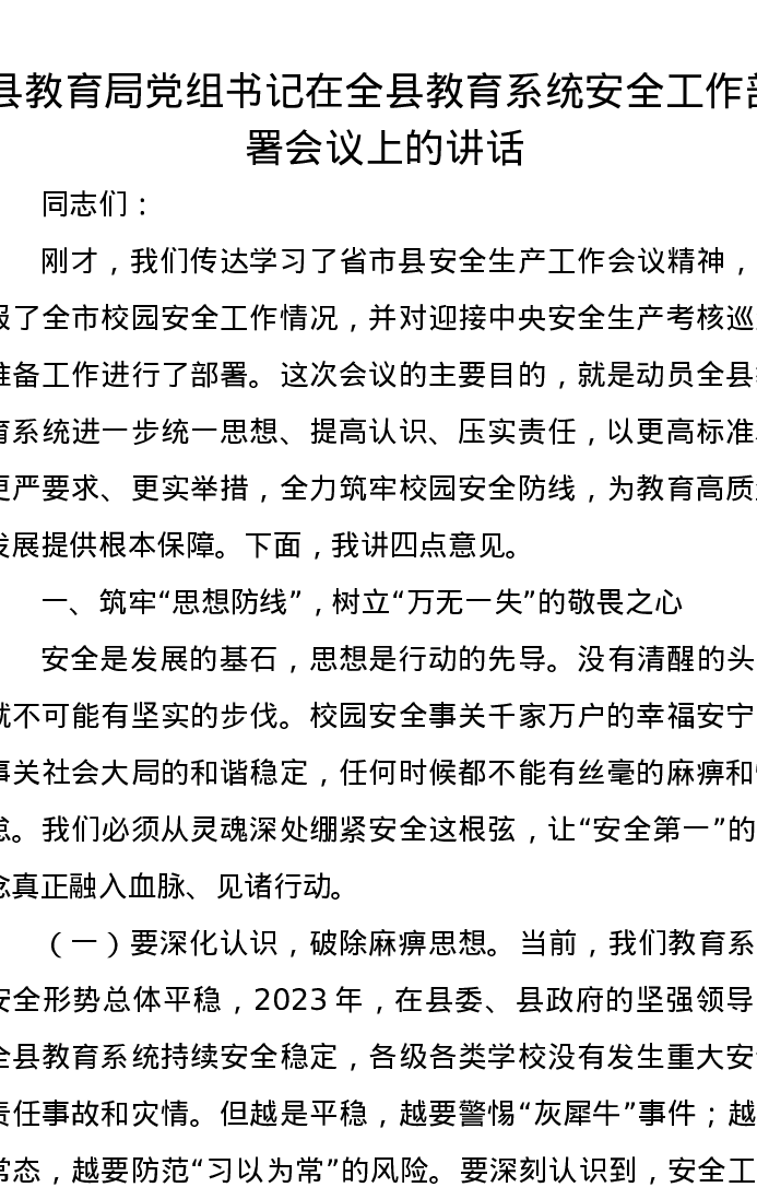 县教育局党组书记在全县教育系统安全工作部署会议上的讲话