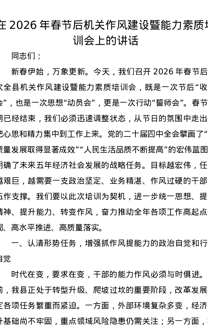 在2026年春节后机关作风建设暨能力素质培训会上的讲话