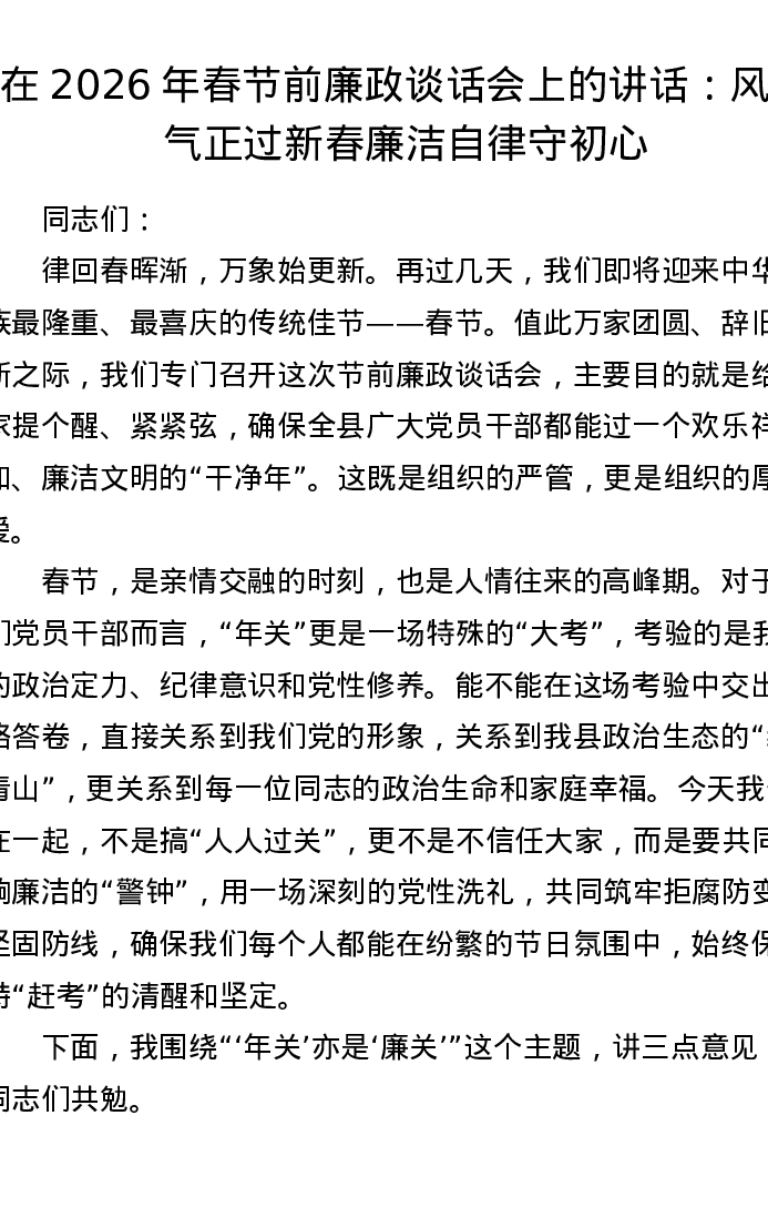 在2026年春节前廉政谈话会上的讲话:风清气正过新春 廉洁自律守初心