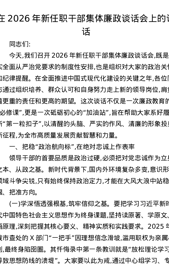 在2026年新任职干部集体廉政谈话会上的讲话