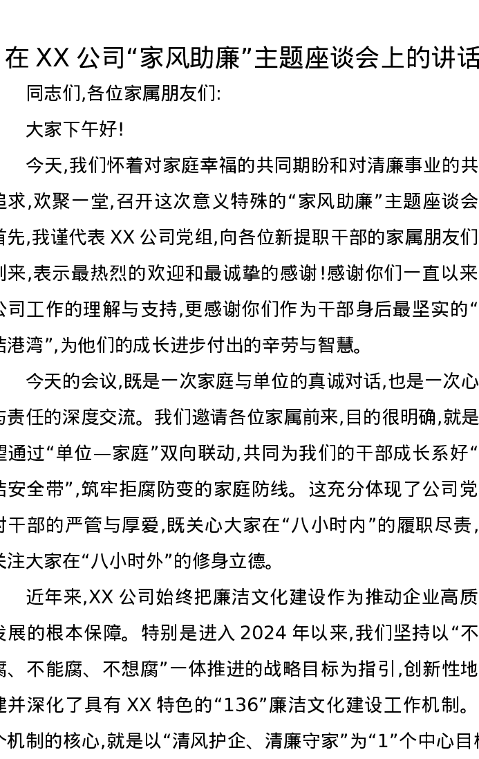 在XX公司家风助廉主题座谈会上的讲话