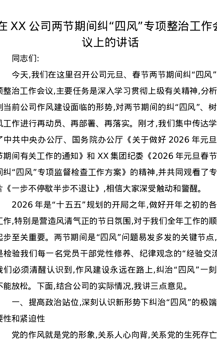 在XX公司两节期间纠四风专项整治工作会议上的讲话