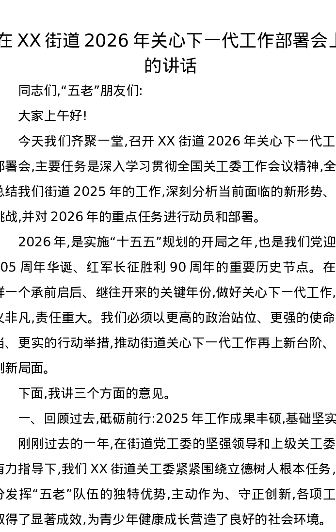 在XX街道2026年关心下一代工作部署会上的讲话