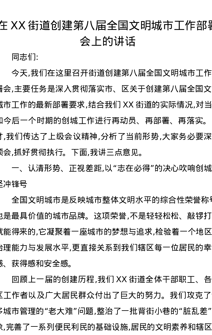 在XX街道创建第八届全国文明城市工作部署会上的讲话
