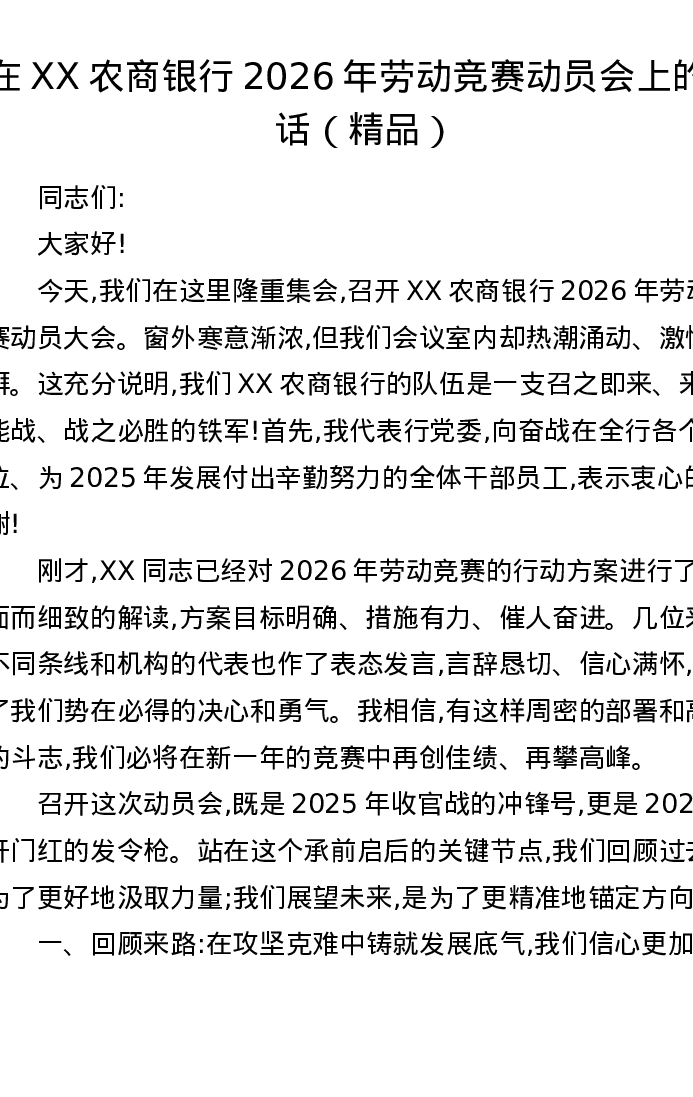 在XX农商银行2026年劳动竞赛动员会上的讲话