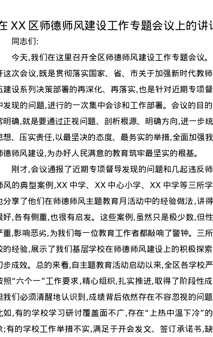 在XX区师德师风建设工作专题会议上的讲话