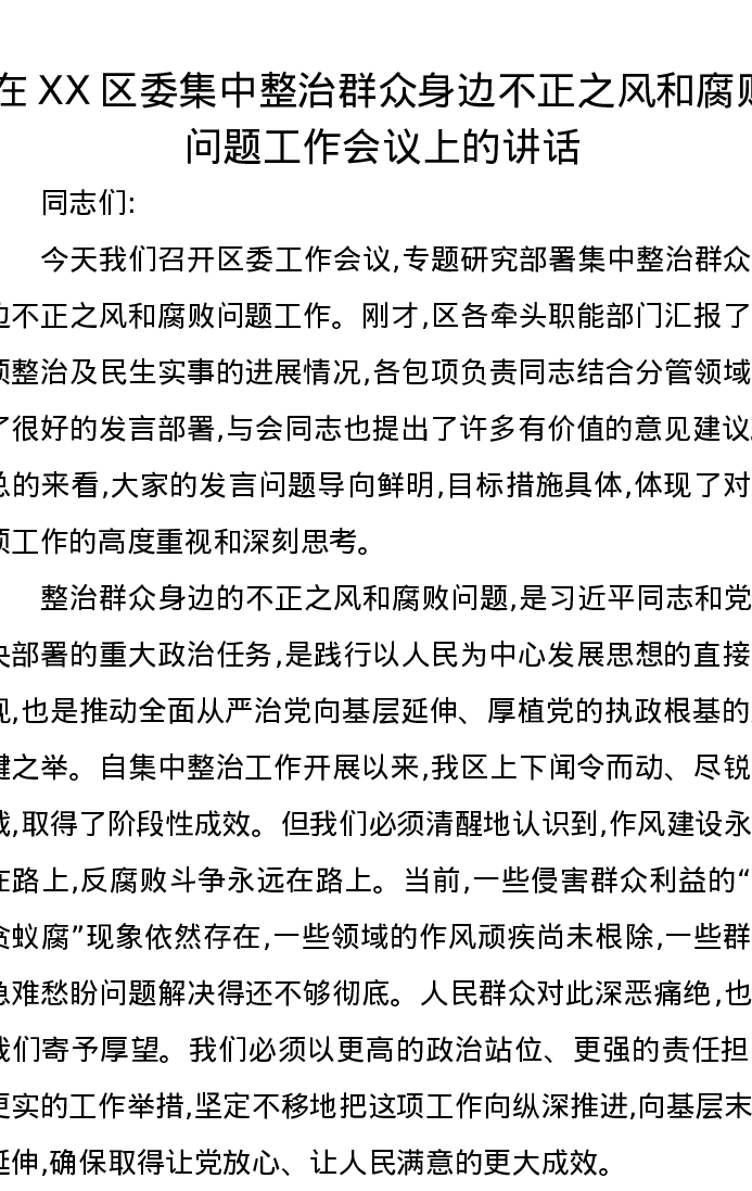 在XX区委集中整治群众身边不正之风和腐败问题工作会议上的讲话