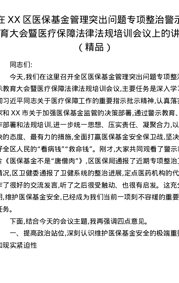 在XX区医保基金管理突出问题专项整治警示教育大会暨医疗保障法律法规培训会议上的讲话