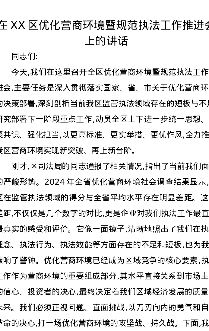 在XX区优化营商环境暨规范执法工作推进会上的讲话