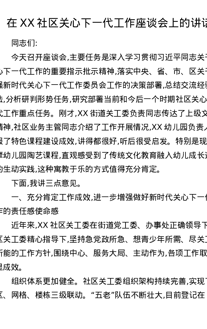 在XX社区关心下一代工作座谈会上的讲话