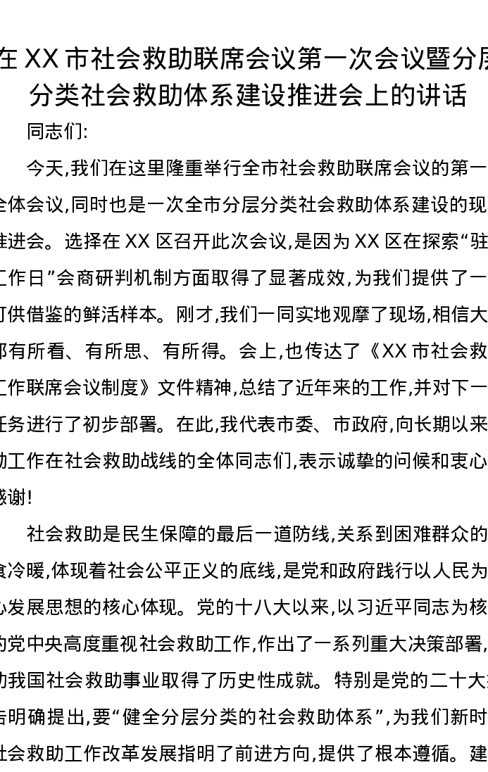 在XX市社会救助联席会议第一次会议暨分层分类社会救助体系建设推进会上的讲话