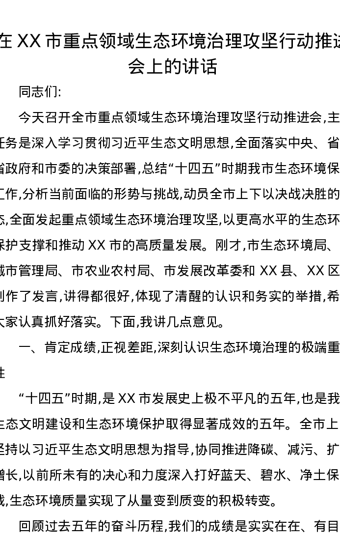 在XX市重点领域生态环境治理攻坚行动推进会上的讲话