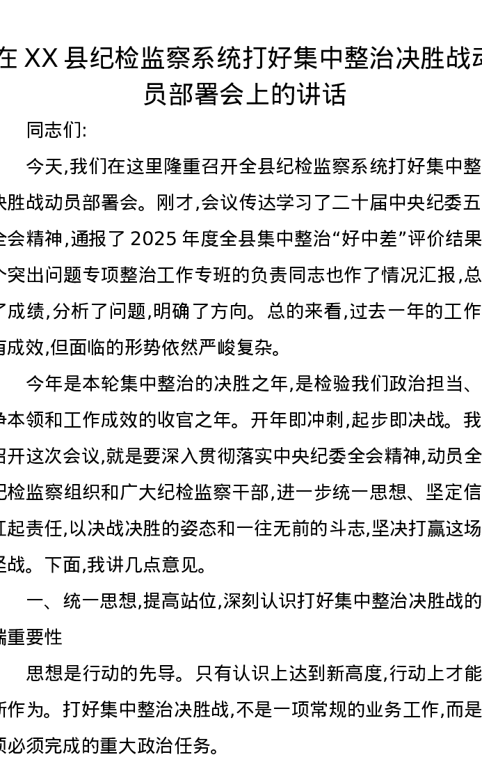 在XX县纪检监察系统打好集中整治决胜战动员部署会上的讲话