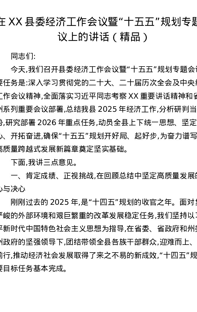 在XX县委经济工作会议暨十五五规划专题会议上的讲话