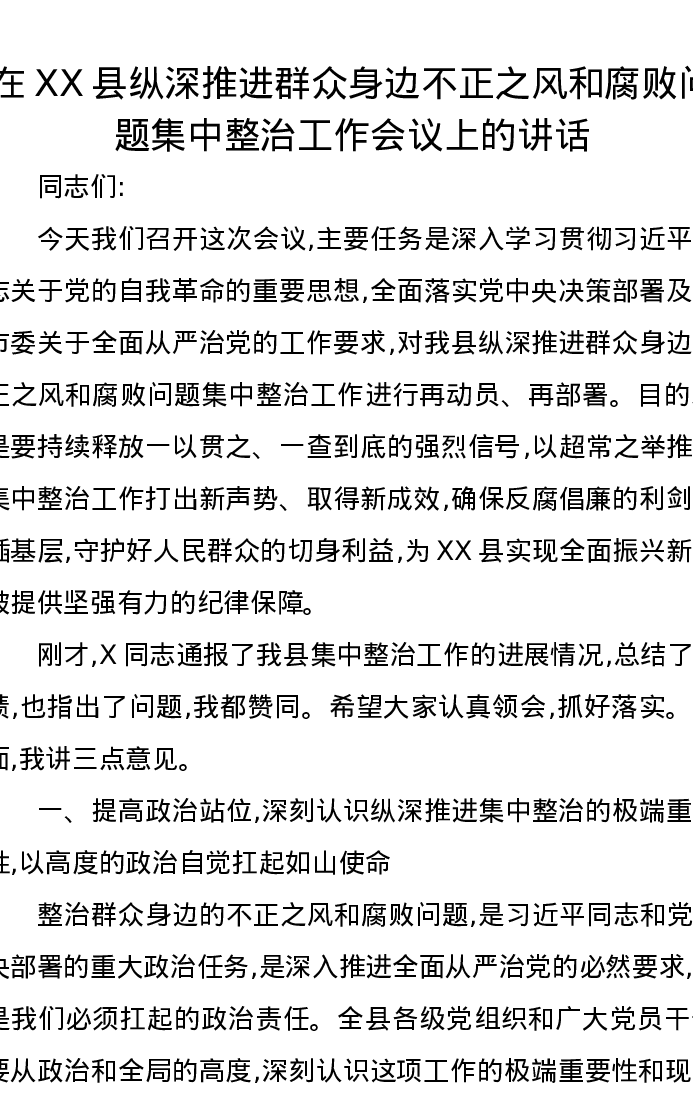 在XX县纵深推进群众身边不正之风和腐败问题集中整治工作会议上的讲话