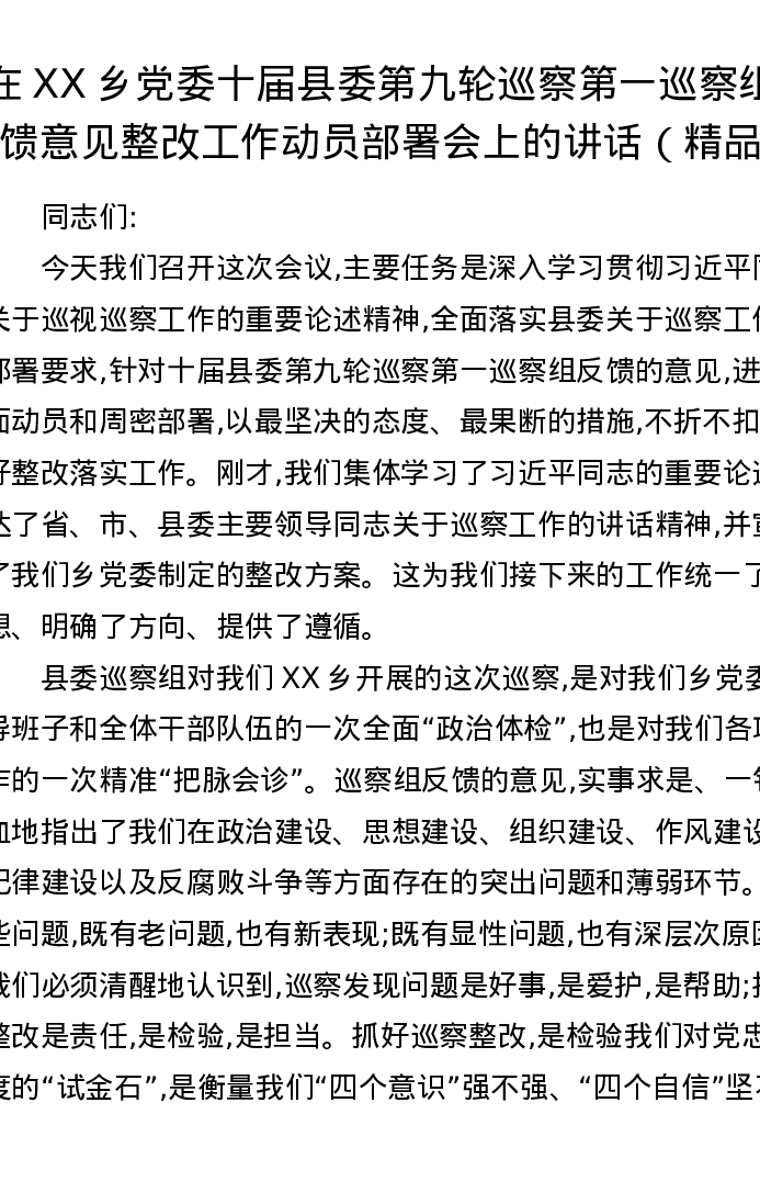 在XX乡党委十届县委第九轮巡察第一巡察组反馈意见整改工作动员部署会上的讲话