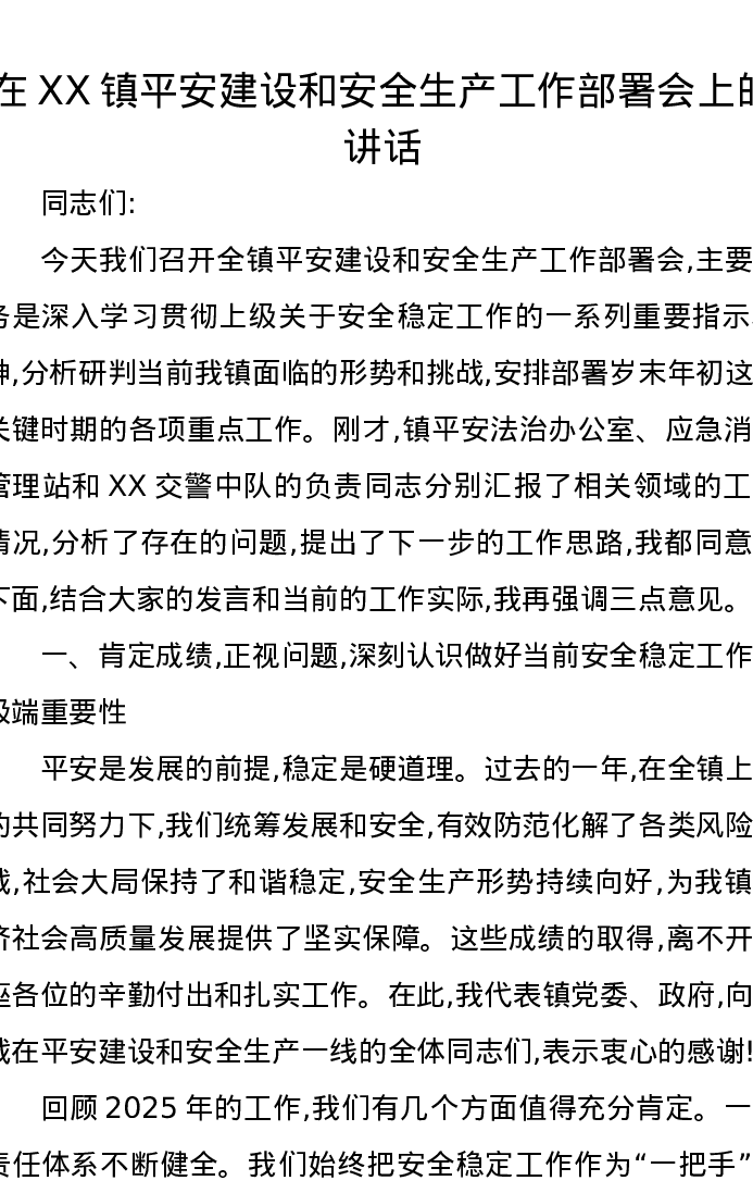 在XX镇平安建设和安全生产工作部署会上的讲话