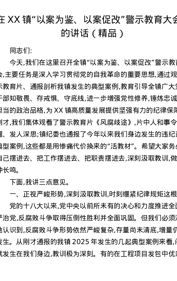 在XX镇以案为鉴、以案促改警示教育大会上的讲话