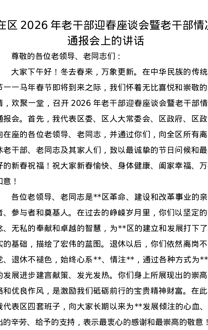 在区2026年老干部迎春座谈会暨老干部情况通报会上的讲话