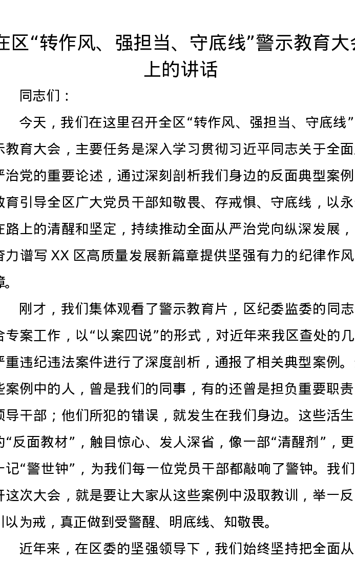 在区转作风、强担当、守底线警示教育大会上的讲话