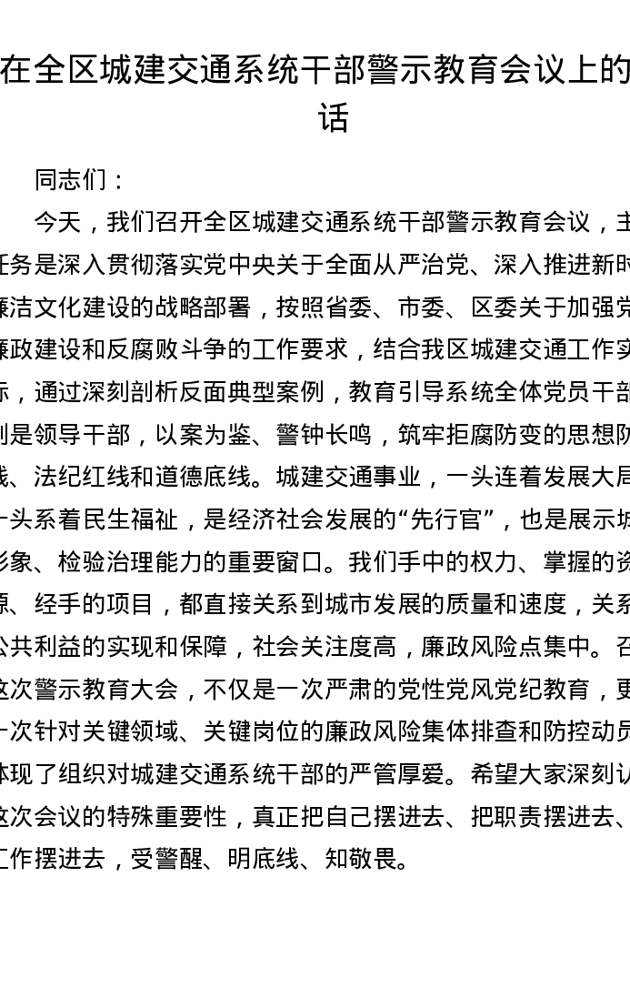 在全区城建交通系统干部警示教育会议上的讲话
