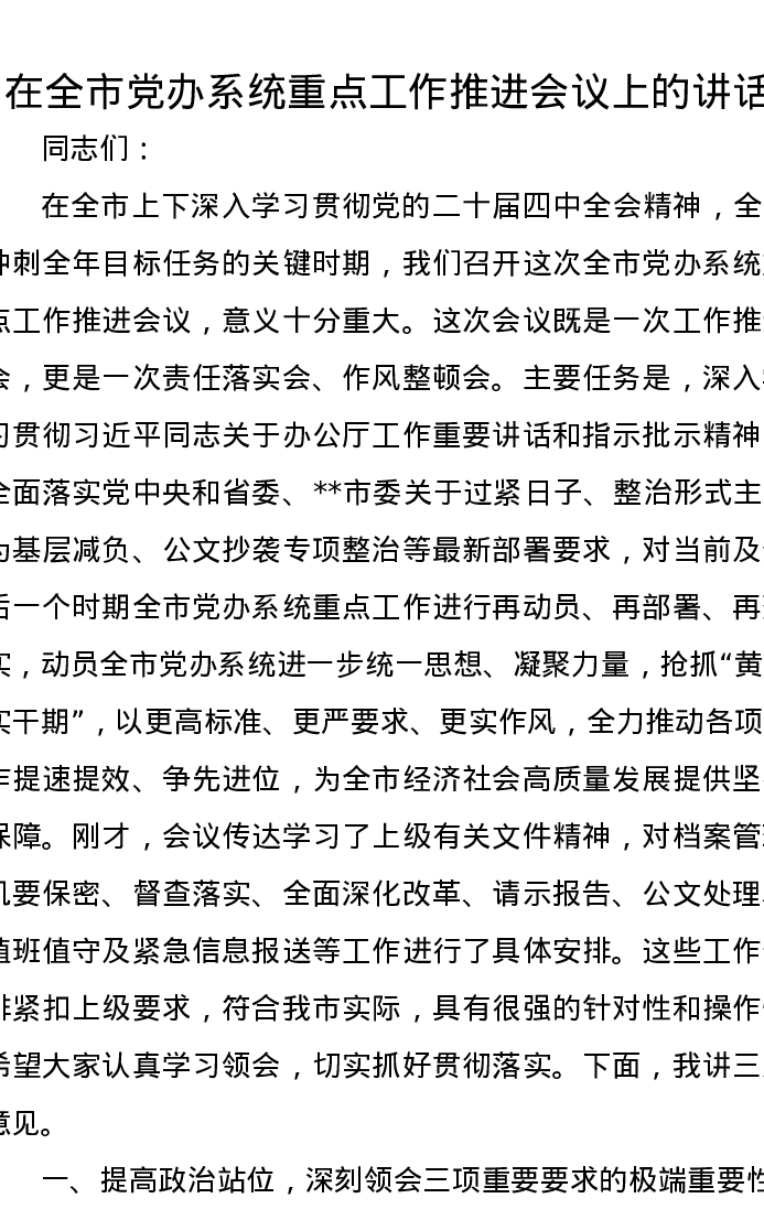 在全市党办系统重点工作推进会议上的讲话