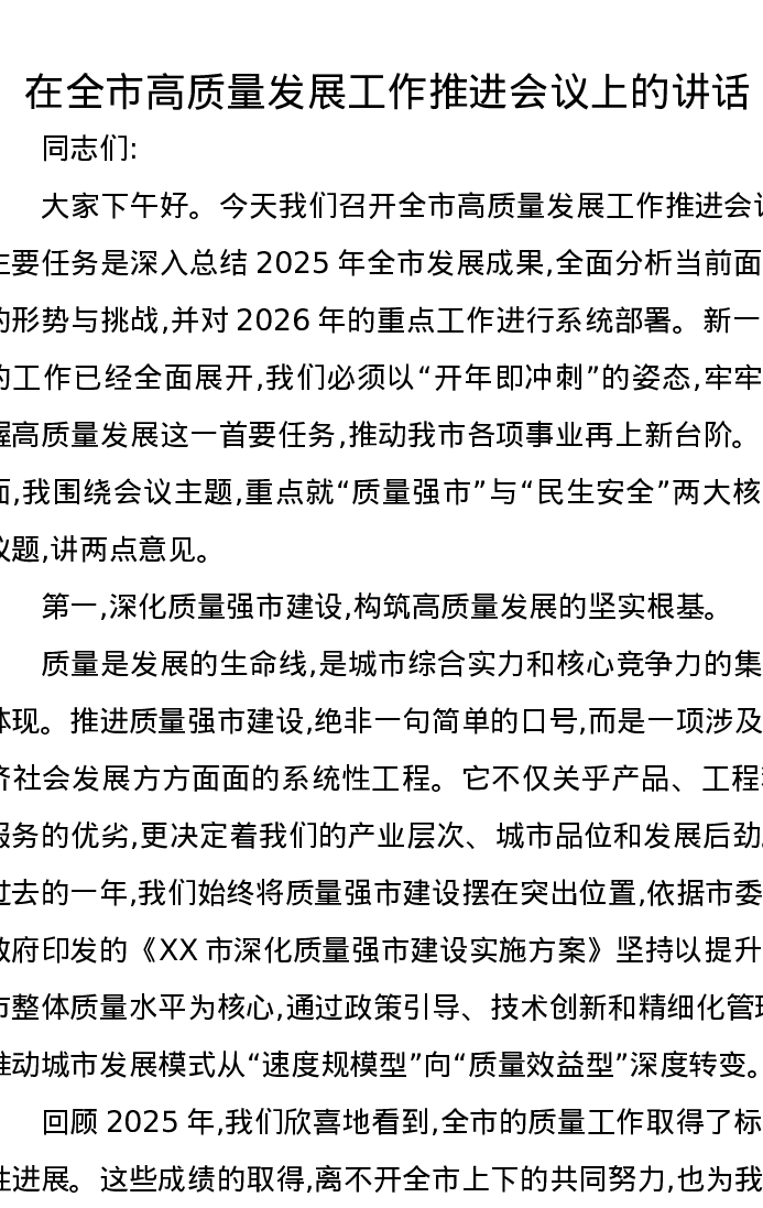 在全市高质量发展工作推进会议上的讲话
