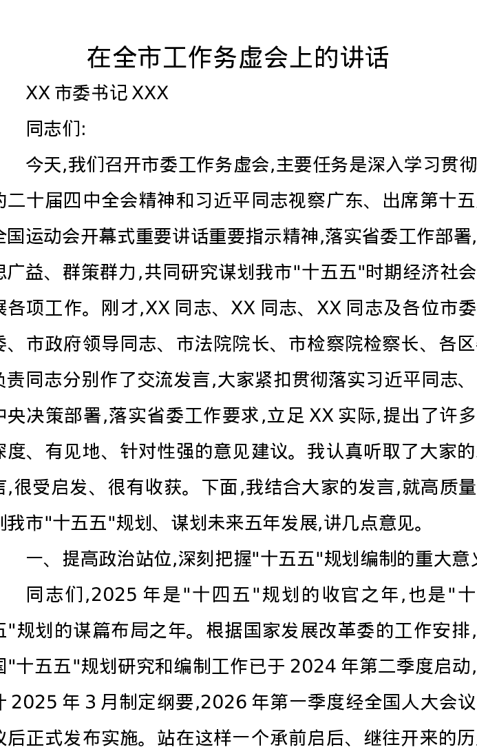 在全市工作务虚会上的讲话