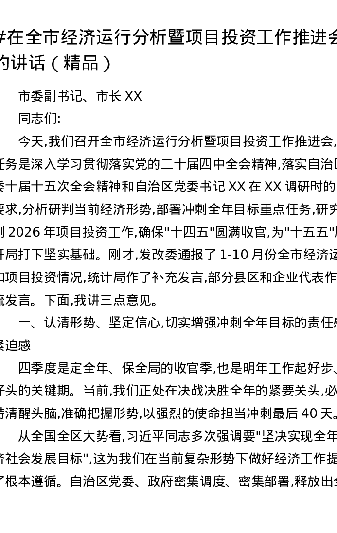 在全市经济运行分析暨项目投资工作推进会上的讲话