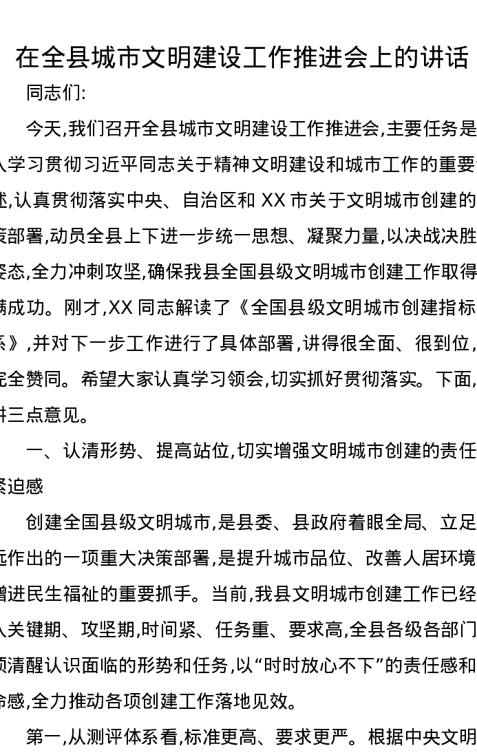 在全县城市文明建设工作推进会上的讲话
