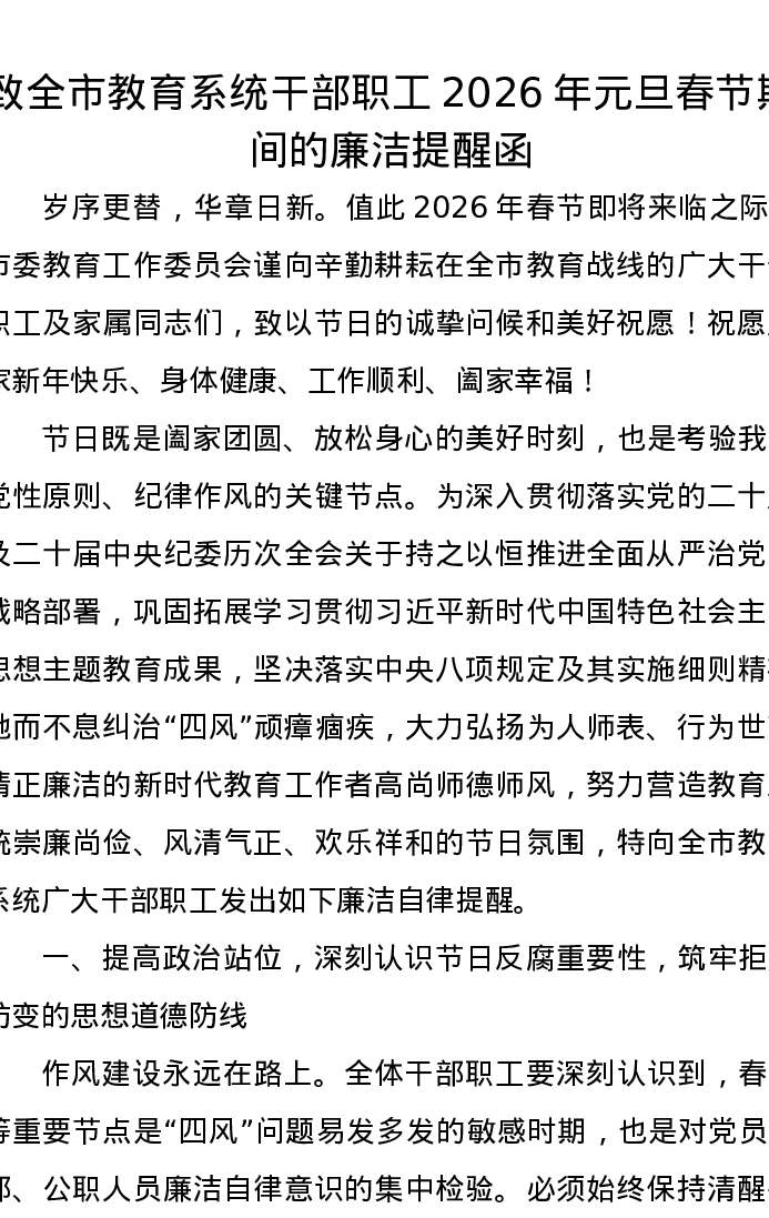 致全市教育系统干部职工2026年元旦春节期间的廉洁提醒函