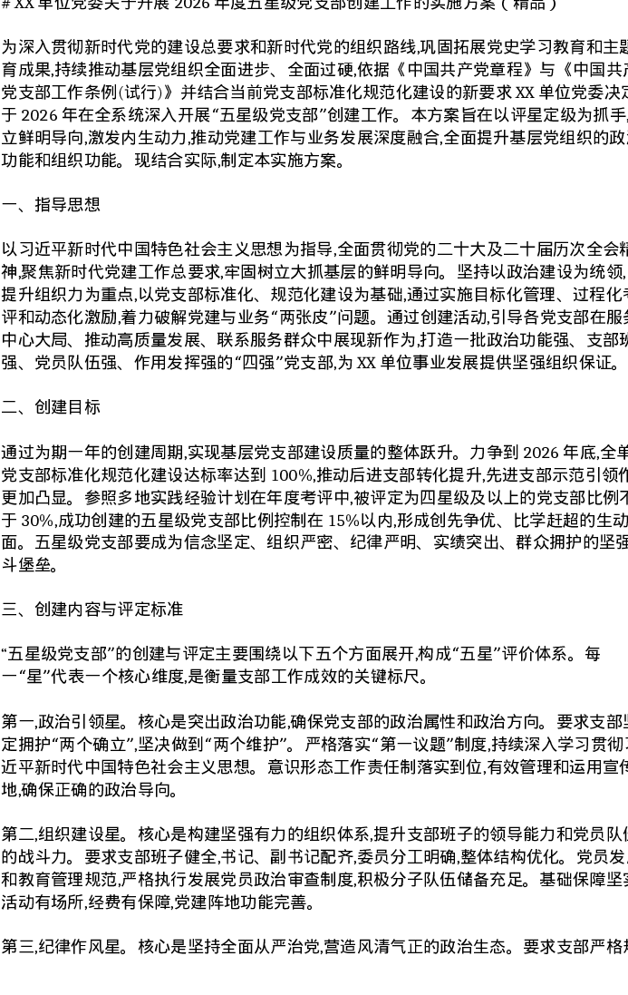 XX单位党委关于开展2026年度五星级党支部创建工作的实施方案