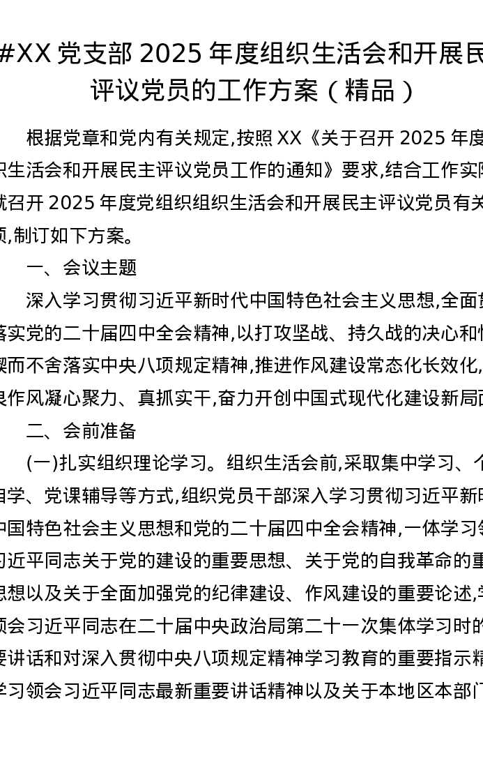 XX党支部2025年度组织xxx和开展民主评议党员的工作方案