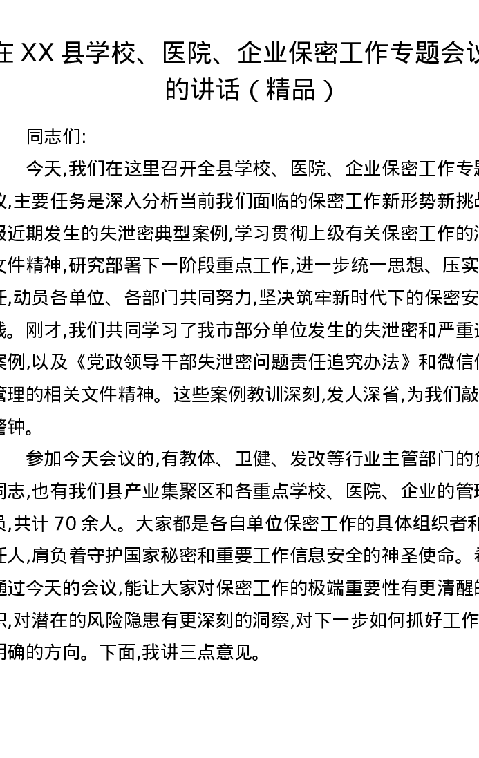 在XX县学校、医院、企业保密工作专题会议上的讲话