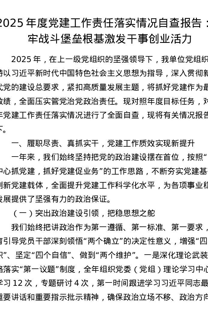 2025年度党建工作责任落实情况自查报告:筑牢战斗堡垒根基 激发干事创业活力