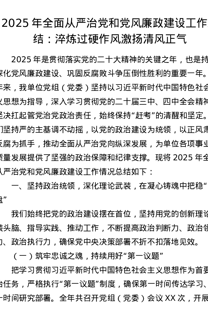 2025年全面从严治党和党风廉政建设工作总结:淬炼过硬作风 激扬清风正气