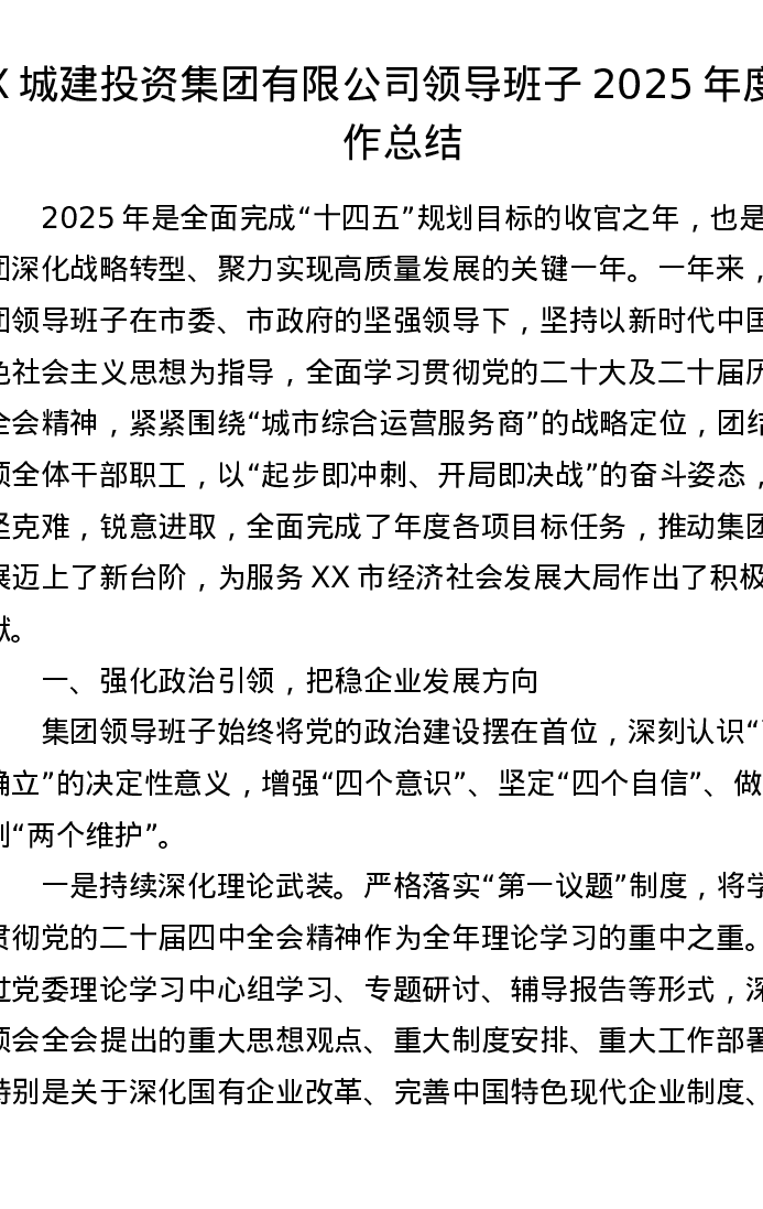XX城建投资集团有限公司领导班子2025年度工作总结