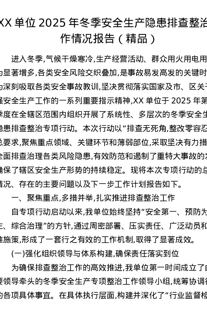 XX单位2025年冬季安全生产隐患排查整治工作情况报告