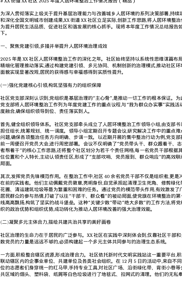 XX街道XX社区2025年度人居环境整治工作情况报告