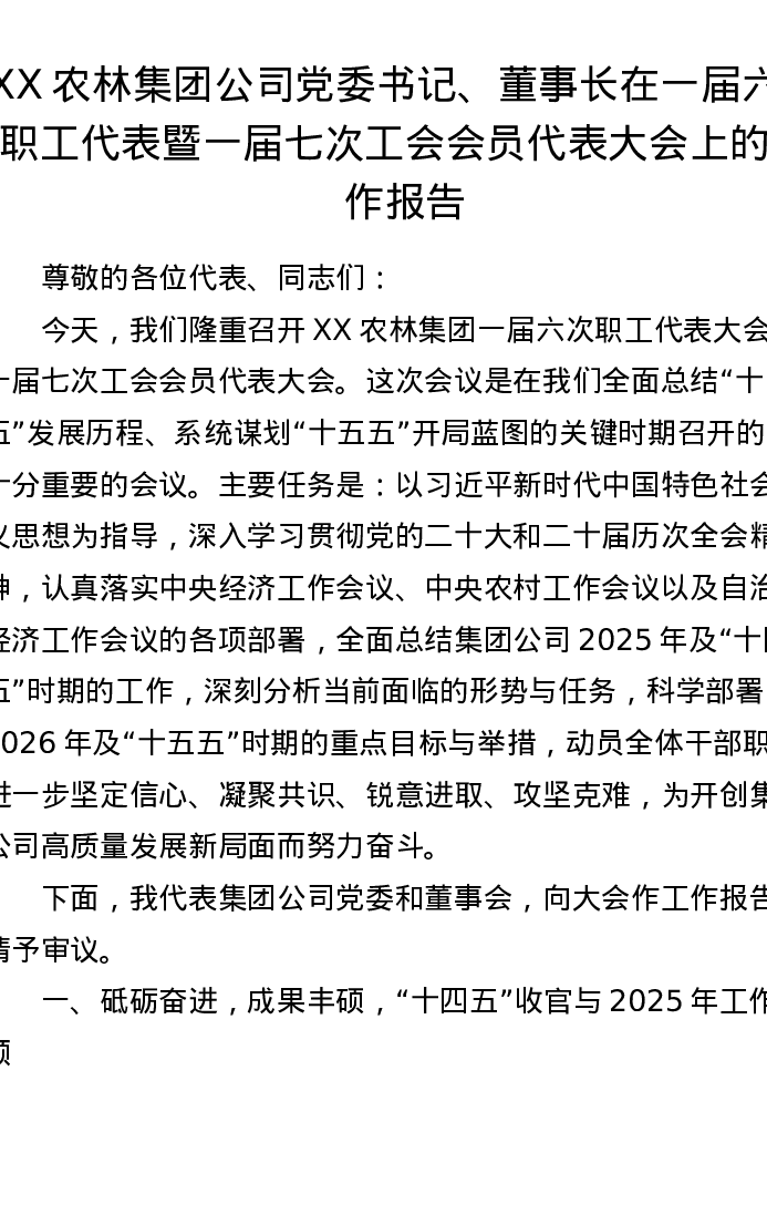 XX农林集团公司党委书记、董事长在一届六次职工代表暨一届七次工会会员代表大会上的工作报告