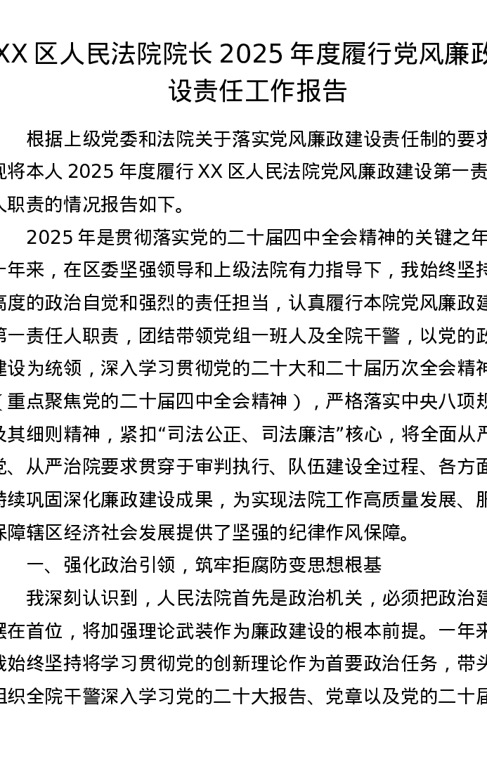 XX区人民法院院长2025年度履行党风廉政建设责任工作报告