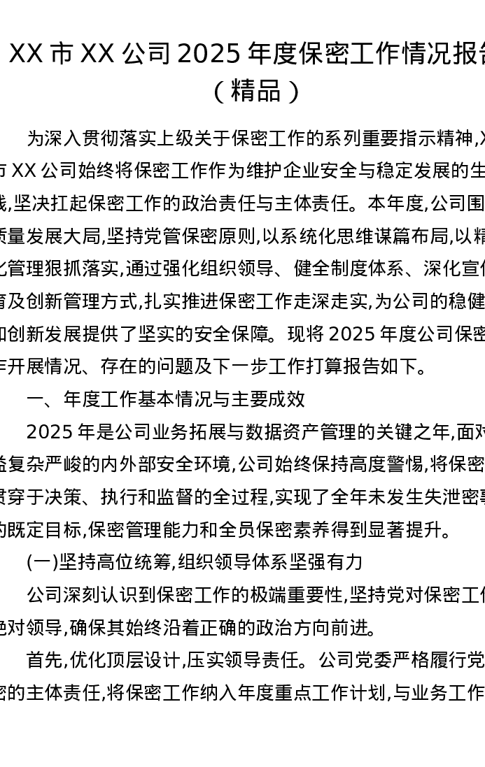 XX市XX公司2025年度保密工作情况报告