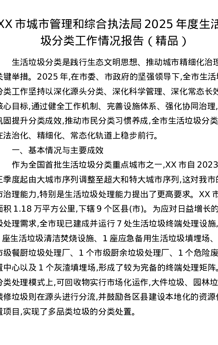 XX市城市管理和综合执法局2025年度生活垃圾分类工作情况报告