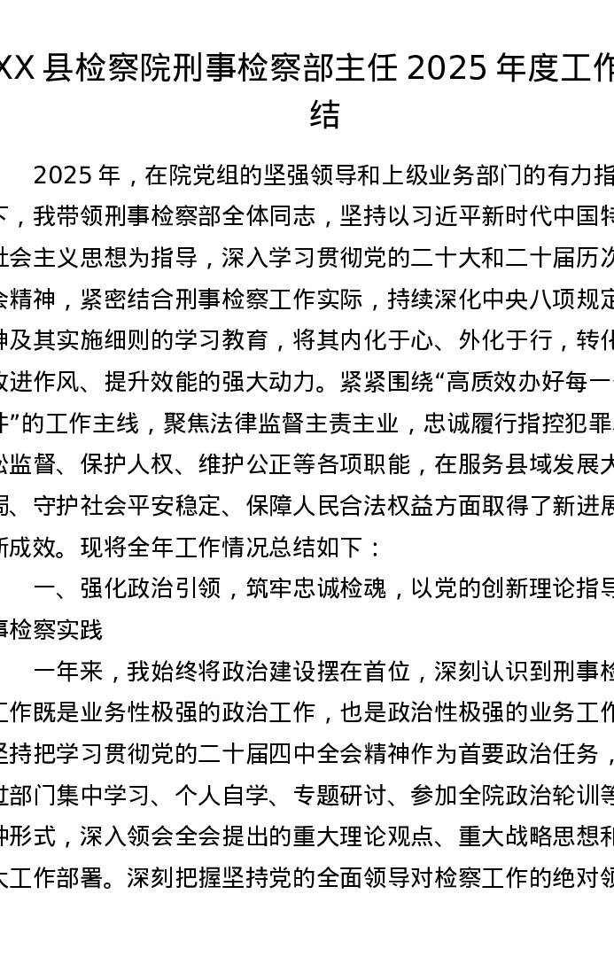 XX县检察院刑事检察部主任2025年度工作总结
