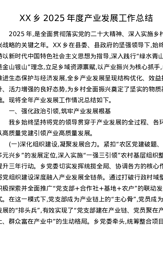 XX乡2025年度产业发展工作总结
