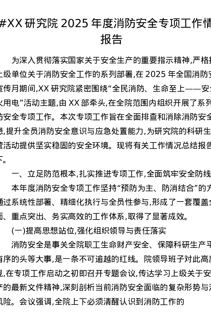 XX研究院2025年度消防安全专项工作情况报告